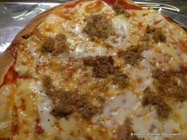 מכניסים לתנור שחומם מראש ל- 200 מעלות, למשך 20 דק' (או עד שקצוות הפיצה משחימים), ומקבלים פיצה עסיסית וקרנצ'ית.
